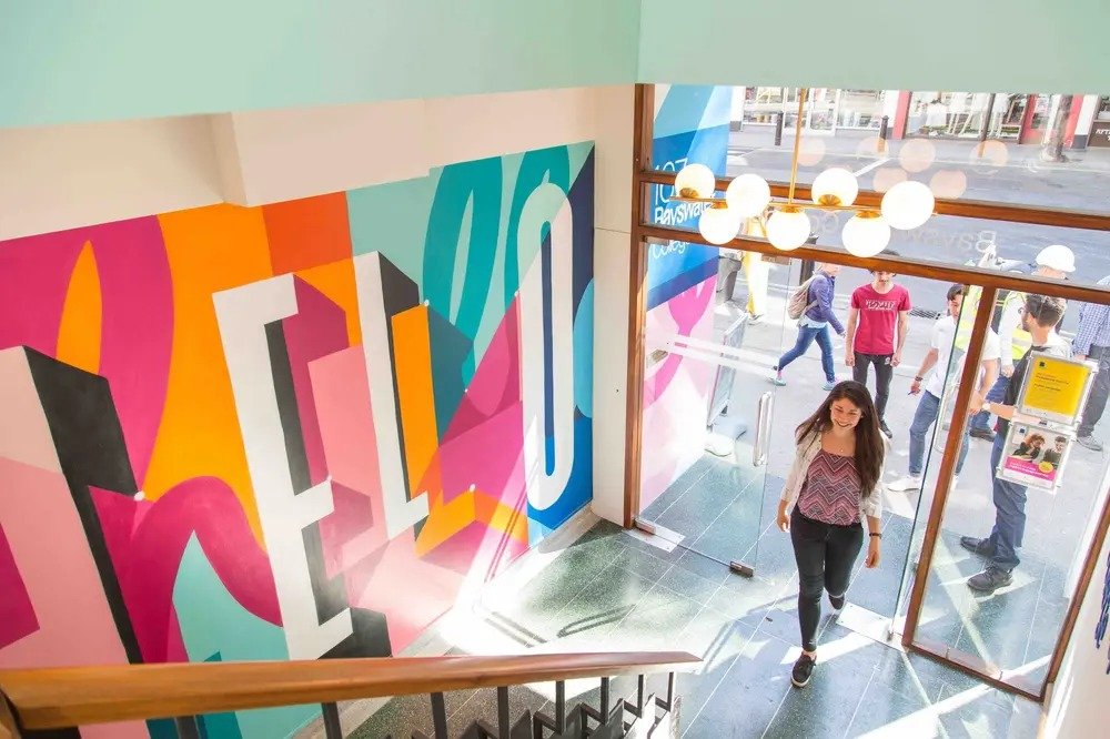 The design incorporates bold colour palettes, feature graphics, and open social areas that reflect the international nature of the college and provide welcoming spaces for students.